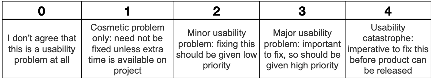 There are three factors to consider when assigning severity: the frequency, impact, and persistence of a problem (https://www.nngroup.com/articles/how-to-rate-the-severity-of-usability-problems/). The rating scale is as follows:
