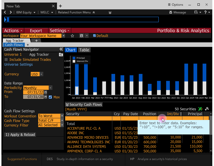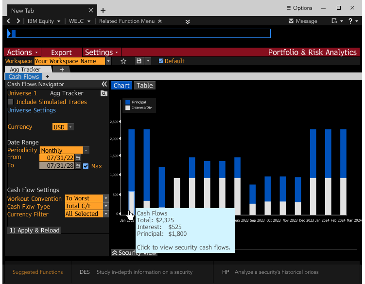 A graph view outlines total cash. The design showcases the improved workflow of seeing the underlying securities that make up that cash distribution on the same screen for ease.