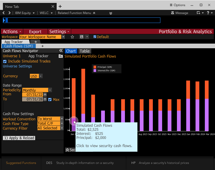 Provided the ability for clients to view simulated portfolio aggregate cash flows chart view and interaction. Since there was no need to see current and simulation side-by-side, we simplified the delivery.