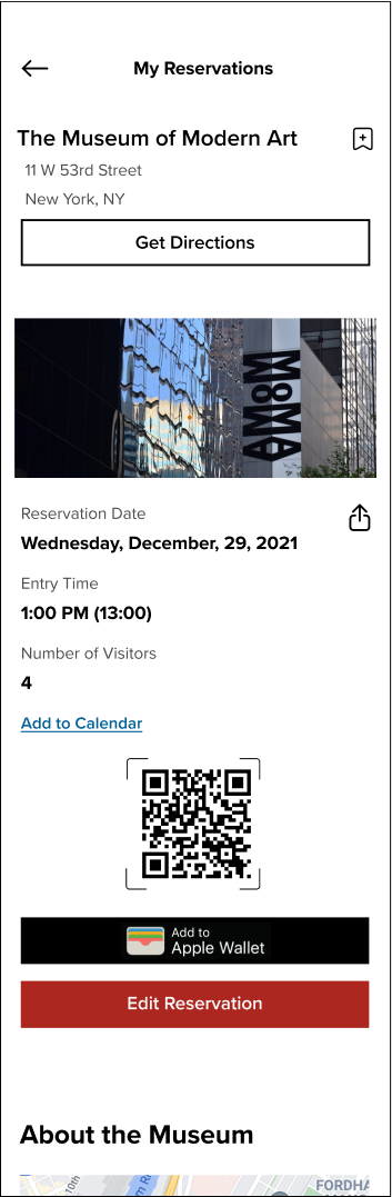 Easily accessible QR code for presenting upon arrival, “Add to wallet” capability, edit/cancel reservations