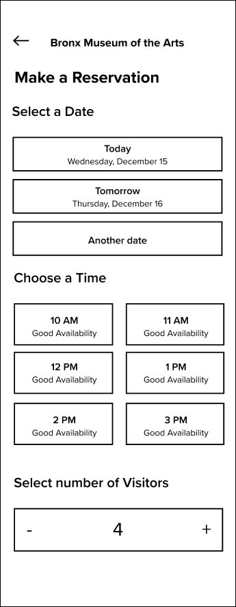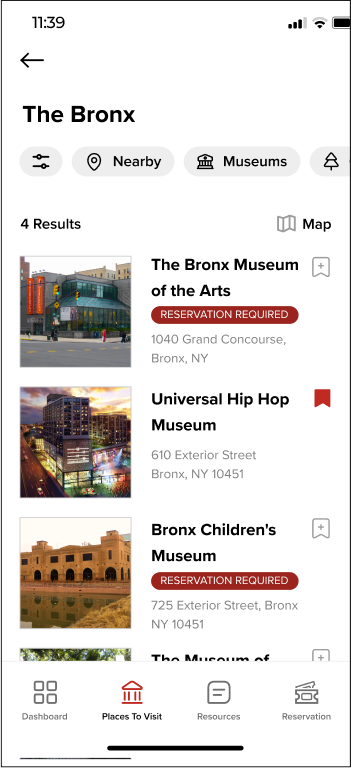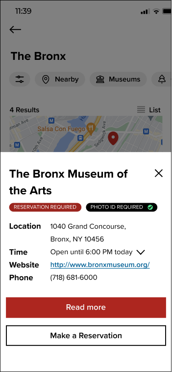 Given the feedback, we focused on designing for discoverability of institutions that are free and the ability to book a reservation directly from the app. Though we discussed that registration would also be done through the app, the wireframes did not include this.