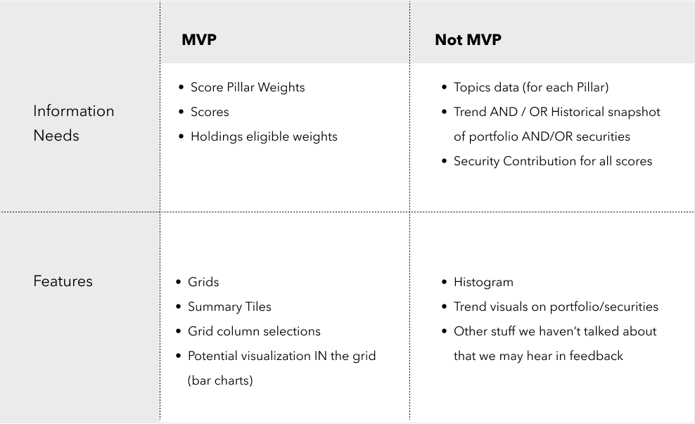 The immediate feedback was discussed with product. Given the fast timelines, these concepts were not pursued because there was no strong use case that validated those features needs, not to mention, the primary focus was to create an MVP product for our ESG users.