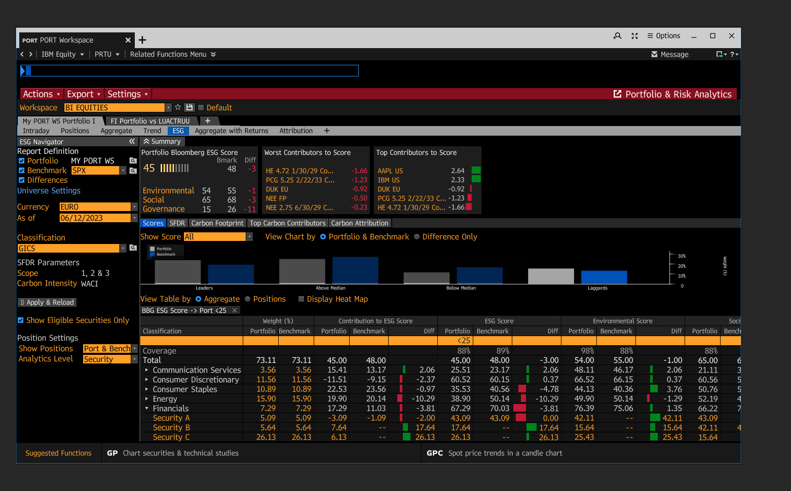 A Histogram version showcased how a portfolio measured against its benchmark given a breakdown of ESG performance in the following categories: Leaders, Above Median, Below Median, Laggards.